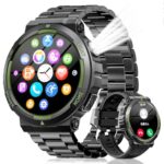 スマートウォッチ(黒緑色)は軍用規格、Bluetooth通話、GPS連動、100+運動モード、3ATM防水、400mAhバッテリー、カメラ音楽制御、音声アシスタント機能付き。1.53インチ大画面で、iPhone/Android対応。