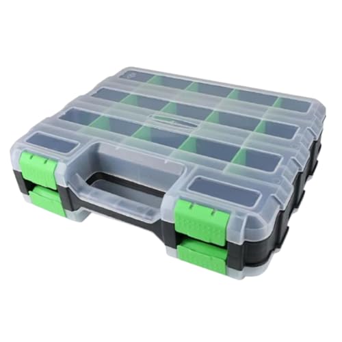 両面パーツケースは34分割の収納が可能な透明オーガナイザーボックス。工具整理やハンドメイド、釣り、裁縫、アクセサリー収納に最適。家庭用・業務用の多用途収納ケースです。カラーはグリーン。