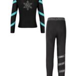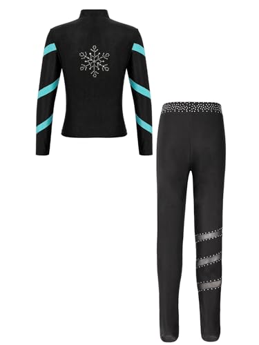 子供用の女の子向けフィギュアスケートウェア。キラキラのラインストーン付きのアイススケートジャケットとレギンスのセット。体操用トラックスーツ、青緑色、対象年齢7-8歳。