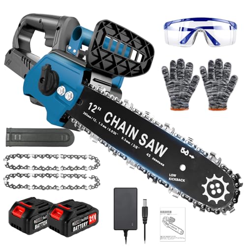 12インチ強力電動チェーンソー、300mm切断径。21V・4000mAhバッテリー2個付、マキタ互換。自動給油、コードレス、安全ロック。家庭用、木工、庭木の剪定に最適。日本語マニュアル、サポート、PSE認証済み。