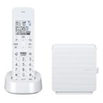 シンプルなデザインのコードレス電話機。コンパクトで場所を取らず、電話線もすっきり。迷惑電話防止機能付きで安心。カラーはホワイト系で、家庭やオフィスに最適。型番JD-SF3CL-W。