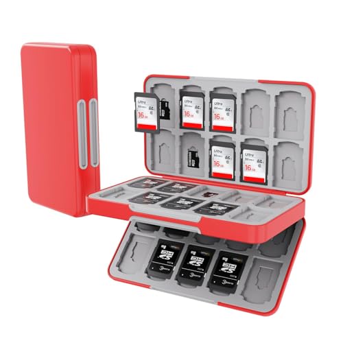 PGRTYOF SDカードケースは80枚収納可能で、40枚のSD/SDSHC/SDSXCカードと40枚のMicroSD/TF/MSDカードに対応。耐衝撃、防塵、防湿機能付きで、大容量を持ち運びに便利な赤色デザインです。