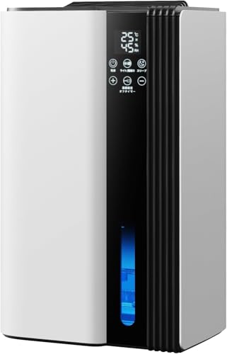 小型2.5L除湿器、最大除湿量1000ml/日。マイナスイオン機能付きで、20畳鉄筋・10畳木造対応。静音・省エネ設計、湿度自動調整、満水時自動停止。七色ライト搭載、リビングや寝室、台所、押入れに最適。