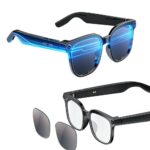 スマートグラスは、AI機能搭載の軽量41gで、800万画素の動画・写真撮影が可能。防ブルーライト、紫外線対策も完備。フォトクロミックレンズで屋内外問わず使用でき、翻訳機や音楽再生も対応。