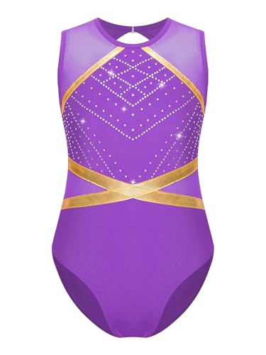 Aislorの子供用女の子向け体操用レオタードは、輝くダイヤモンド入りのキーホールバックデザイン。紫色で10歳向け、ユニタードやバイクタード、フィギュアスケート用のジャンプスーツとしても最適。