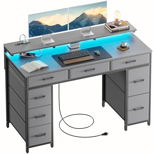 HLFURNITUREのゲーミングデスクは幅120cm、奥行52cm。8つの布製引き出し、LEDライト、USB電源ソケット付き。学習やオフィス用としても利用可。安定感とデザイン性が魅力のグレー仕様。