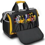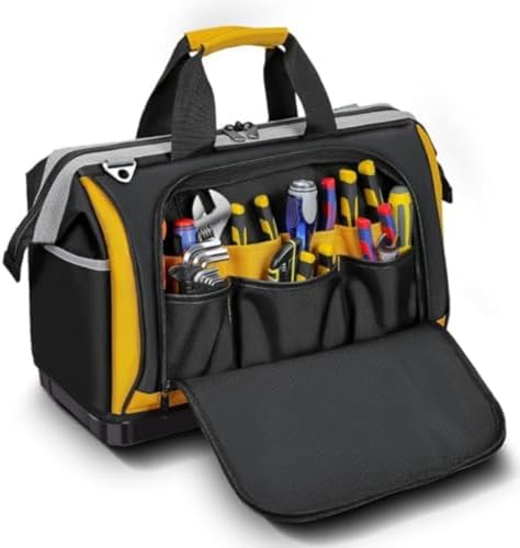 HACYURIの大容量工具バッグは、25ポケット付きで1680Dオックスフォード素材を使用。自立可能なプラスチック底部により、作業用や電気用の道具が整理しやすく、持ち運びも便利です。サイズは40×22×35cm。