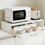 Temilar レンジ下ラックは、スライドテーブル付きで横幅調整可能。キッチン家電や調味料を整理でき、省スペース設計。引き出し付きで、スチール製の作業台としても利用可能で、便利な補助テーブルです。