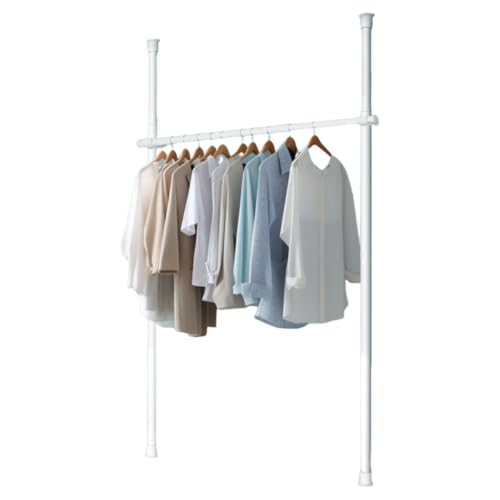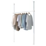 QAMITALの伸縮式洋服ハンガーは、高さ調節可能で2層式の室内物干しです。パンチフリーで天井と床に設置可能、110~300cmのサイズに対応し、シンプルなブラックとホワイトの2色展開。