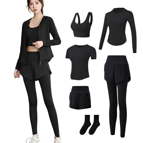 Senteriaの5点セットスポーツウェアは、レディースのヨガ、トレーニング、ランニングに最適。伸縮性と通気性に優れ、吸汗速乾機能付き。ジャージ、スポーツブラ、レギンス、パーカー、短パンツ、靴下1足が含まれています。ブラックカラーで、春夏秋冬使えます。