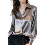 Kayiyasuのブラウスは、サテン製で光沢感があり、Vネック立ち襟デザイン。春向け、長袖で無地の上品な着こなしが可能。サイズはS-XLで、ビジネスや通勤に最適。