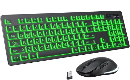 大型文字ワイヤレスキーボード&マウスセット(US配列104キー)。7色バックライト、明るさ調整機能、可調式キースタンド搭載。Windows/PC/ノートパソコン対応。