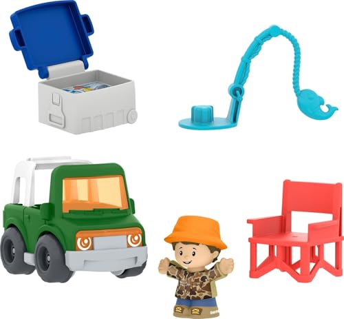 Fisher-Priceリトルピープルの幼児用おもちゃセット。釣りと旅行をテーマにしたフィギュアと乗り物5点が含まれ、1歳以上のお子様に最適。ごっこ遊びで創造力を育みます。