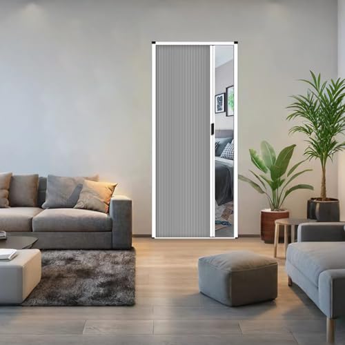 Wetsfgdgのアコーディオンドアは、幅120cm・高さ210cmの白いフレームに灰色のデザイン。喫茶店や子供部屋の仕切りに最適で、穴あけ不要の非破壊設置が可能です。