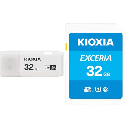 KIOXIAのセット買い商品には、32GB USB3.2 Gen1 USBフラッシュメモリと32GB SDHC UHS-I Class10 SDカードが含まれており、国内サポートと5年保証が付いています。