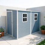 樹脂製の大型物置で、サイズは幅132cm、奥行き254cm、高187cm。床材補強フレーム付きで、引き戸両開きタイプ。換気口があり、防さび・防水機能付き。ベランダやガーデニング、庭に最適なグレーの収納庫です。