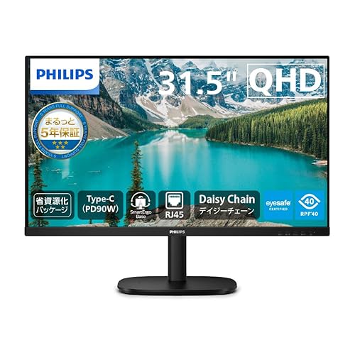 PHILIPS 31.5インチIPS液晶モニター、QHD解像度、100Hz、1ms応答速度、5年保証、HDMI、DP、Type-C(PD90W)、デイジーチェーン、RJ45、AdaptiveSync対応、内蔵電源、エナジースター認証。