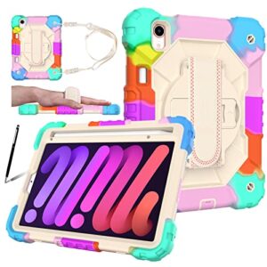 2021モデルiPad Mini第6世代ケースiPad mini6 8.3インチ PC+シリコン製3重構造ケースiPad Mini 2021戸外 持ち歩け楽 耐衝撃 防塵 頑丈丈夫 キッズ子供 保護 携帯便利 全面保護ケース【MYH】アイパッドミニ6 8.3インチApple Pencil収納とApple Pencil 2 ワイヤレス充電対応 360°回転スタンド 調節可能 手持ちの肩掛けー付きタブレット ケース(color D)両用タッチペン付き