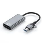 ユニバーサルメモリカードリーダーは、ダブルUSB Type-Cコネクタを搭載し、コンピュータやモバイルデバイスでのデータ転送に対応しています。