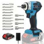電動インパクトドライバーは、充電式・コードレスで、マキタ18Vバッテリー互換。最大トルク360N.mのブラシレスモーター搭載。360°リングライト、6種のモードと5段階強度調整、自動停止機能を備え、小型でDIYにも最適。