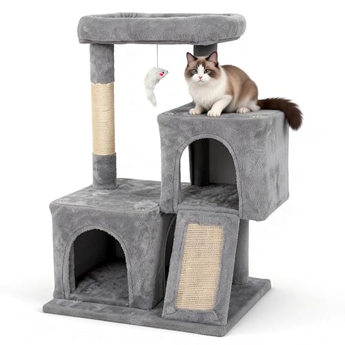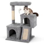 Saiveinaキャットタワーは、高さ75cmで小型の据え置き型です。安定感があり、猫が楽しめるおもちゃ、猫ベッド、爪とぎ、隠れ家を装備。運動不足の解消に最適なグレーのデザインです。