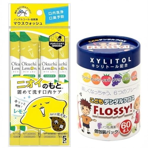 【セット品】こどもデンタルフロスFLOSSY!60本+オクチレモン携帯用マウスウォッシュ5本の2点セット。外出時のオーラルケアと口臭対策に最適。食後やおやつ後の歯間ケアと口をすすぐのがこれ1セットで完了。