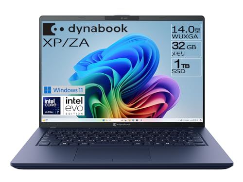 dynabook ノートパソコン XP/ZAは、Core Ultra 7プロセッサー搭載、14型ディスプレイ、SSD、セルフ交換バッテリーによる高性能モデル。OSはWindows 11 Home、色はダークテックブルーです。