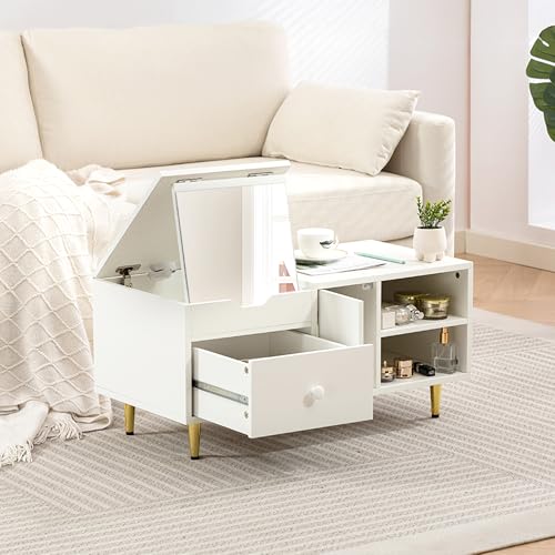Dowinxのドレッサーはコンパクトで、ローテーブルとしても使用可。大サイズの鏡や引き出し付きで収納力抜群。おしゃれで省スペースに最適、一人暮らしにピッタリなホワイトの化粧台です。