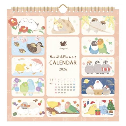 鳥の記念日がわかる壁掛けカレンダー2026「さえずり」。縦255×横250mm、日曜日始まり、六曜入り。鳥の情報が楽しめる、自然好きにはぴったりのアイテムです。