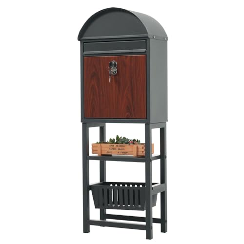 丸型ダークグレーと木目調の郵便ポスト一体型宅配ボックス。A4対応で鍵付き、かごと傘立て付き。北欧デザイン、防錆仕様の高級メールボックス。一戸建てに最適。