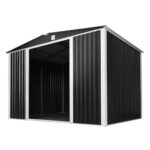 シェッドワールドの大型屋外物置、幅300cm、奥行240cm、高さ205cm。強化フレーム、鍵付きでおしゃれなダークグレーのメタルシェッド。引き戸設計、床ありで収納力抜群。