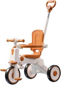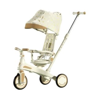 JNNJ三輪車は6か月から6歳まで使用可能。手押し棒、大きな日よけ付きで雨や日差しから保護。座ったり横になったりでき、ガードレールは切り替え可能な機能満載の折りたたみ式乗用玩具。
