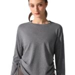 MORGEN SKYの女性用長袖アクティブシャツ。サイドプリーツデザインで快適な着心地。ストレッチ素材を使用し、フィットネスやヨガに最適なプルオーバー。シンプルな無地で、グレーのMサイズ。