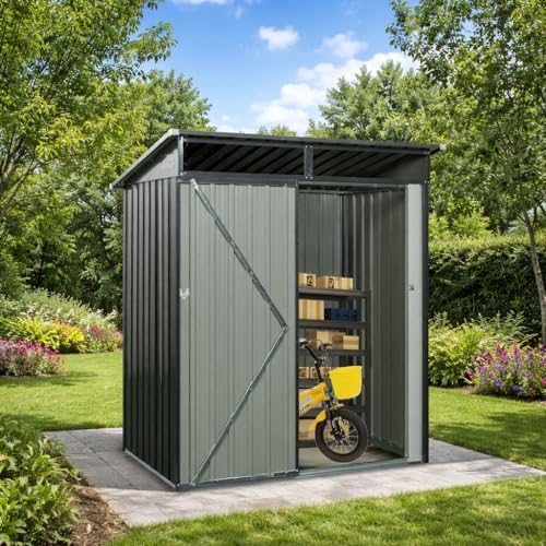 屋外大型倉庫は幅164cm、奥行き111cm、高さ181cmのスチール製で、換気口付きのデザインです。防さび・防水機能を備え、ガーデニングや工具収納、タイヤ収納に最適な大容量収納庫です。
