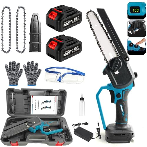 Sxnaota 充電式チェーンソーは、8インチの刃を持ち、21Vの3.0Ah大容量バッテリー2個を搭載。軽量設計と片手操作が可能で、安全ガード付き。ブラシレスモーターにより効率良く枝切り、剪定に対応。LED残量表示、自動給油機能、マキタ18V互換。収納ボックスと日本語説明書も付属。