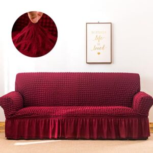 ソファカバー 肘付き2人掛け 3人掛け フリルそふぁーかばー ひんやり マルチカバー 肘あり ストレッチ素材 汚れ防止 キズ防止 伸縮性良く 柔らかい ふわふわ 北欧風デザイン ソファー保護 猫 洗える 厚手 おしゃれ 優しい肌触り感 四季適用 (ワインレッド, 三人掛け)
