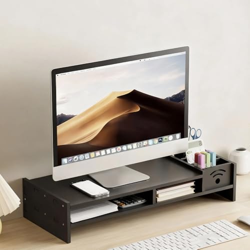 卓上ディスプレイ台はモニタースタンドとしてPCを支え、姿勢改善をサポート。ブラックの机上で文具収納も可能な多機能二段式。ペンスタンドが2つ付属し、作業環境を整えます。
