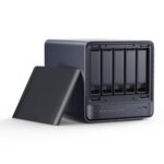 MINISFORUM AI NAS N5 Airは、AMD Ryzen 7 255(8/16T)搭載のミニPCで、SODIMM DDR5-5600MHzスロット2個、SSDスロット3個、HDDスロット5個を備え、5GbE+10GbE LANポートでの高速ネットワーク接続が可能です。