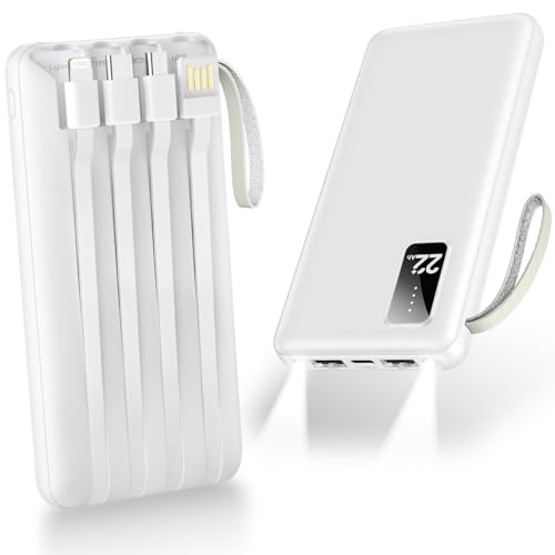 22800mAhの大容量モバイルバッテリー。4本のケーブル内蔵、最大2.4A出力で5台同時充電可能。LED残量表示、ストラップ付きで持ち運びも便利。iOS/Android全機種対応で、停電対策や旅行に最適。