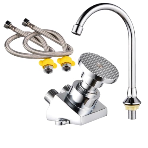 Dazzix足踏み式ミキサータップは、シルバー色の角度付きフットペダルと排水パイプ、ホースを備え、公共の洗面所や工場での節水制御に最適。銅製の質感があり、手足の洗浄に便利です。