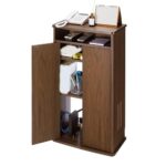 イレクト電話台は木製で、幅48×奥行27×高さ83cmのサイズです。Wi-Fiルーターやモデム、ケーブルを収納でき、FAX台としても使えます。ダークブラウンの木目が美しい並行輸入品です。