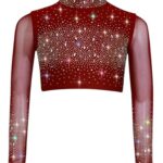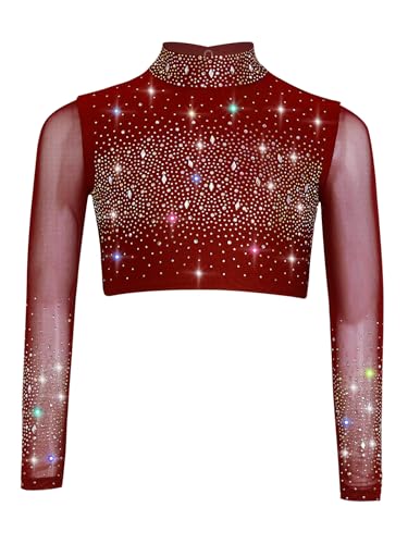 子供用女の子向けのリリカルダンスやフィギュアスケート用、光沢のあるレンガ石入りクロップトップ。長袖、ブルゴーニュ色で13-14歳向け体操着風。