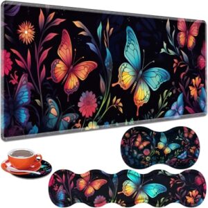 大型ゲーミングテーブルパッド 31.5インチ x 11.8インチ + キーボードリストパッド + マウスリストパッド + コースター ノンスリップベース 4イン1セット、人間工学に基づいたメモリーフォーム、タイピングの痛みの緩和、カラフルな蝶の月模様ブラック