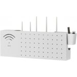 FiveLnの壁掛けラックは、パンチ穴なしでWi-Fi光モデムやネットワークケーブルをスッキリ収納可能。サイズは40*20*10cmでシンプルなホワイトデザイン。