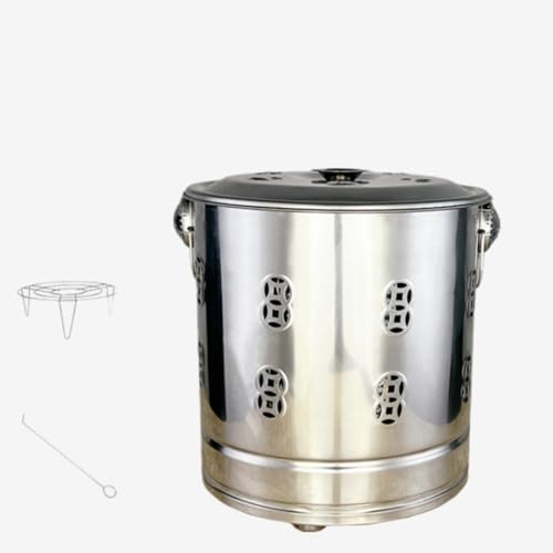 家庭用無煙焼却炉は、耐熱ペイントコートが施されたステンレス製の大型ドラム缶タイプ。サイズは40×40×41cmで、ゴミや紙類の焼却に適しています。火を使っても煙が出にくい設計です。