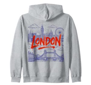 ロンドンの街並みのイラストと太字のペイントテキスト。 ジップパーカー