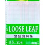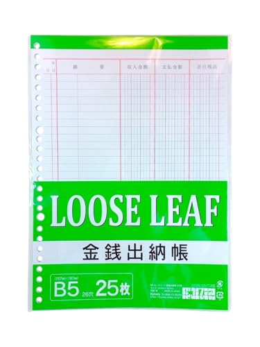 ルーズリーフ 金銭出納帳はB5サイズ、26穴仕様で25枚入り。家計簿として現金管理に最適。経理用リーフとしても使え、整理整頓が捗ります。シンプルなデザインで使いやすさ抜群。