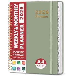【2026年】手帳 ウィークリー マンスリー 手帳 2026年1月~2026年12月 ハードカバー カレンダー 手帳 手帳ブック タブ付き 男女兼用 インナーポケット スパイラル綴じ オフィスホームスクール用品に最適 – A4 (8.5インチ x 11インチ) グリーン