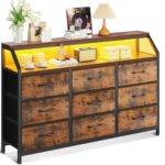 AODKタンスは、引き出し9杯付きで、脱衣所やリビングに最適な収納ケースです。木製天板とLED照明付きで、和風デザインが魅力。ビンテージ風で幅137×奥行30×高さ95cm、大容量で安定感があります。