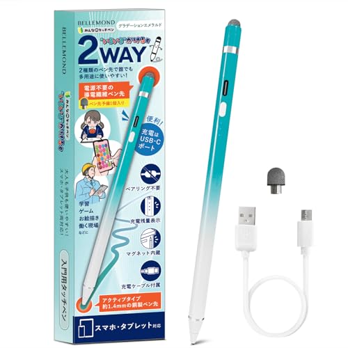ベルモンド タッチペン いろいろかける君 スタイラスペン タブレット スマホ iPad/iPhone/Android対応 2WAY 極細 金属製ペン先 導電繊維ペン先 2個付属 B1287#13 グラデーションエメラルド 高価買取中